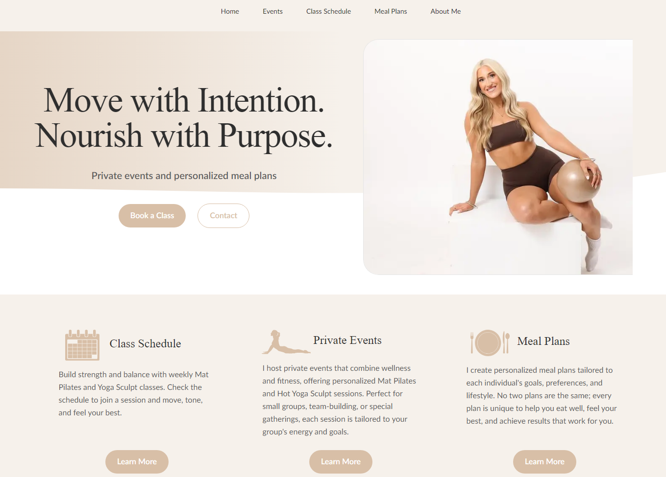 Website for a fitness instructor offering group classes, private events, and personalized meal plans. Built with HTML and Bootstrap CSS, the site features a clean, modern design with easy navigation, class scheduling, and event booking sections, optimized for both desktop and mobile users.